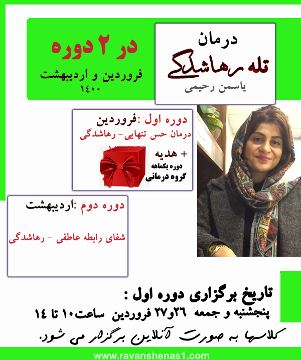 توضیح دوره درمان تله رها شدگی توضیح دوره: دوره درمان تله رها شدگی در دو دوره برگزار می شود: 1-ابتدا بهبودی شخصی و شفای احساسات درونی، با عنوان درمان حس تنهایی- رها شدگی که در تاریخ 26 و 27 فروردین ماه برگزار می شود. 2- دوم شفای رابطه عاطفی ، با عنوان شفای رابطه عاطفی- رهاشدگی چرا در دو دوره؟ ویدئوی توضیح دوره را اینجا ببینید. افرادی که وارد رابطه عاطفی نمی شوند و یا نیستند؛ از لینک :" این دوره مناسب من هست؟" متوجه شدید این دوره به دردتان می خورد و تله رهاشدگی دارید، با همین دوره اول، گره های شخصیتی خودت را پیدا میکنی و بعد از شفای احساسات خودت، و بازسازی خاطراتت یاد می گیری، مهارت کسب می کنی، تا چطور وارد یک رابطه بشوی. بعد از اتمام دوره، گروه درمانی به مدت یکماه که به عنوان هدیه سال نو برای شرکت کنندگان دوره می باشد را شرکت می کنید و دیگر نیازی به شرکت در دوره شفای رابطه را ندارید. برای افرادی که در رابطه عاطفی هستند و مشکلات رابطه اذیتشان می کند؛ از لینک :" این دوره مناسب من هست؟" متوجه شدید این دوره به دردتان می خورد و تله رهاشدگی دارید و در رابطه عاطفی مدام به مشکل خورده اید، این دوره درمان حس تنهایی می شود پیش نیاز دوره بعدی که بازسازی و شفای رابطه عاطفی است. افرادی که مایل به شرکت در دوره شفای رابطه عاطفی هستند ، باید دوره اول را بگذرانند تا بتوانند در دوره بعدی که اردیبهشت ماه هست شرکت کنند . نکته آخر ؛ بعضی ها تله رهاشدگی دارند ولی از وارد شدن به رابطه عاطفی اجتناب می کنند، پس شاید تمایلی به دوره شفای رابطه عاطفی نداشته باشند. خوب باشید. یاسمن رحیمی تلفن کلینیک (دولت) : 26605034 جهت هماهنگی وقت آنلاین پیام در واتس اپ : 09356842637 پیج در اینستاگرام yasamanrahimi__ قبلی بعدی